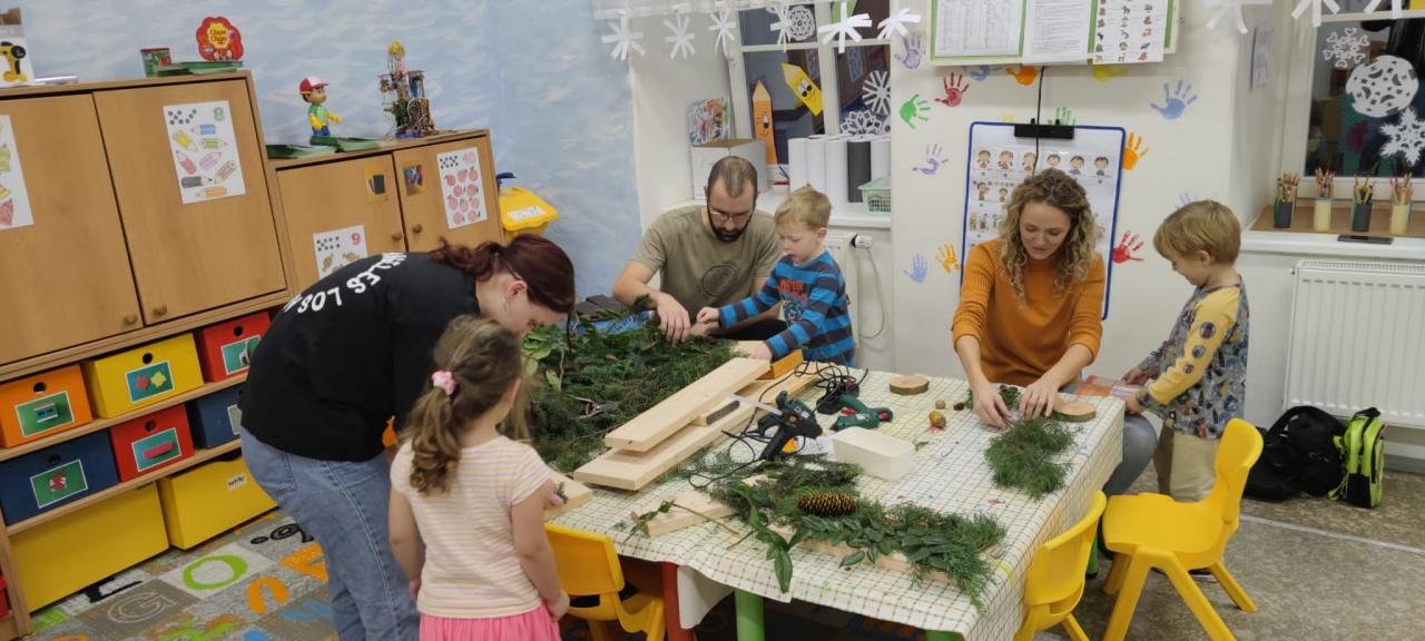 Maminky a tatínci tvoří s dětmi.